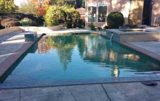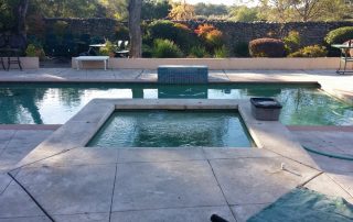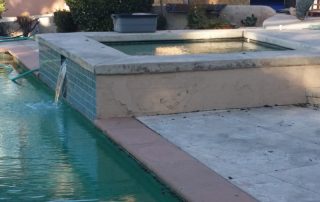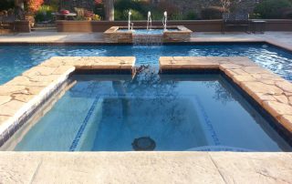 The fountain with three heads not only served as a much more dramatic focal point but it also had enough splash to mitigate the road noise. The whole area looked more balanced with the sparkling pool new finish flanked by the matching spa and fountain. This remodel turned a basic pool to a dramatic showcase backyard.